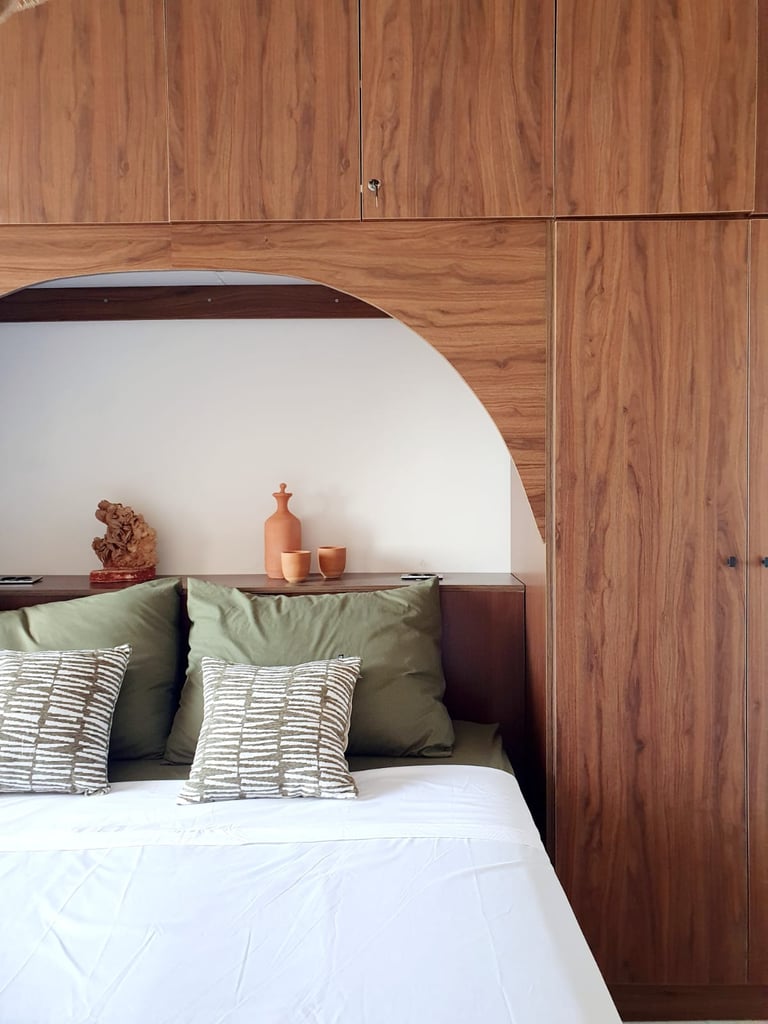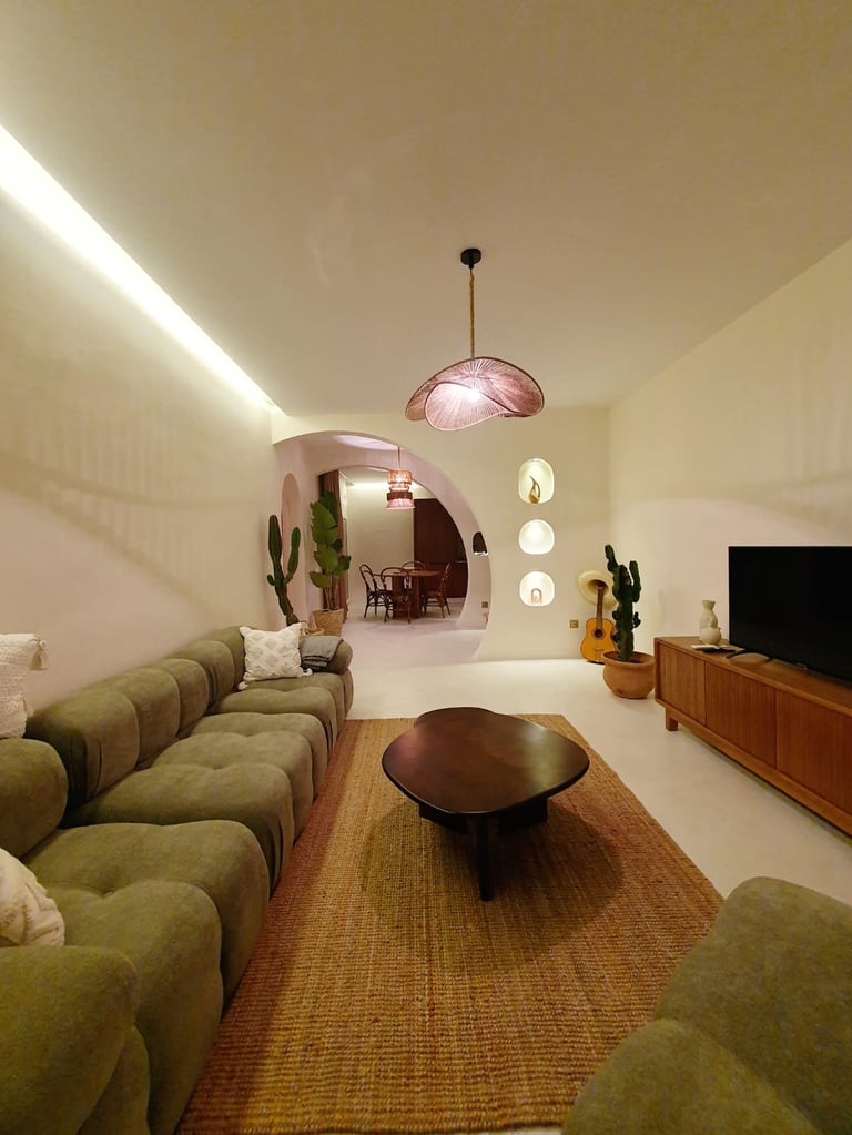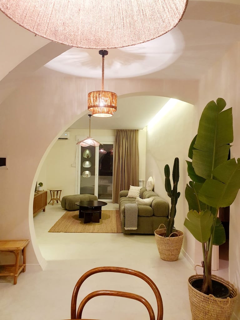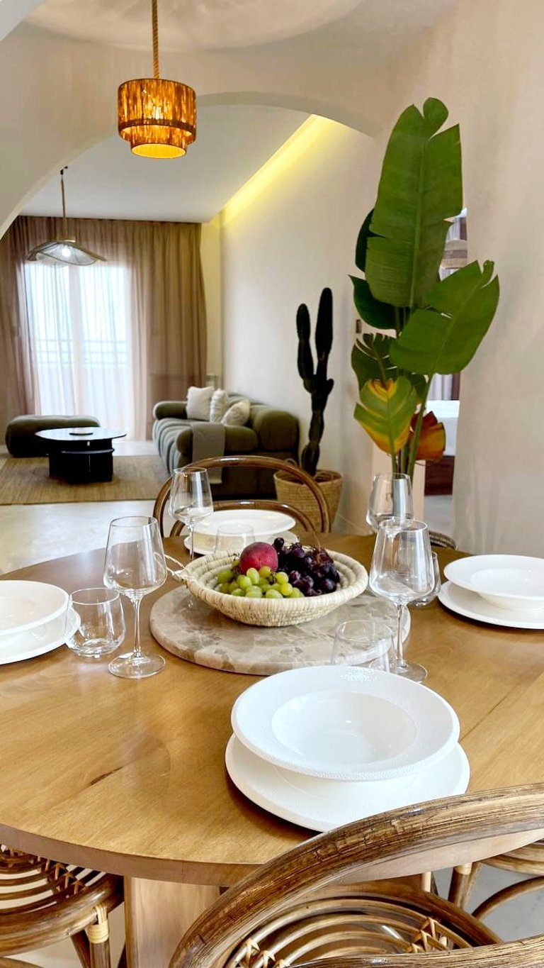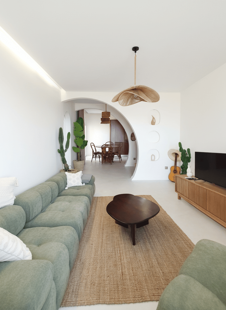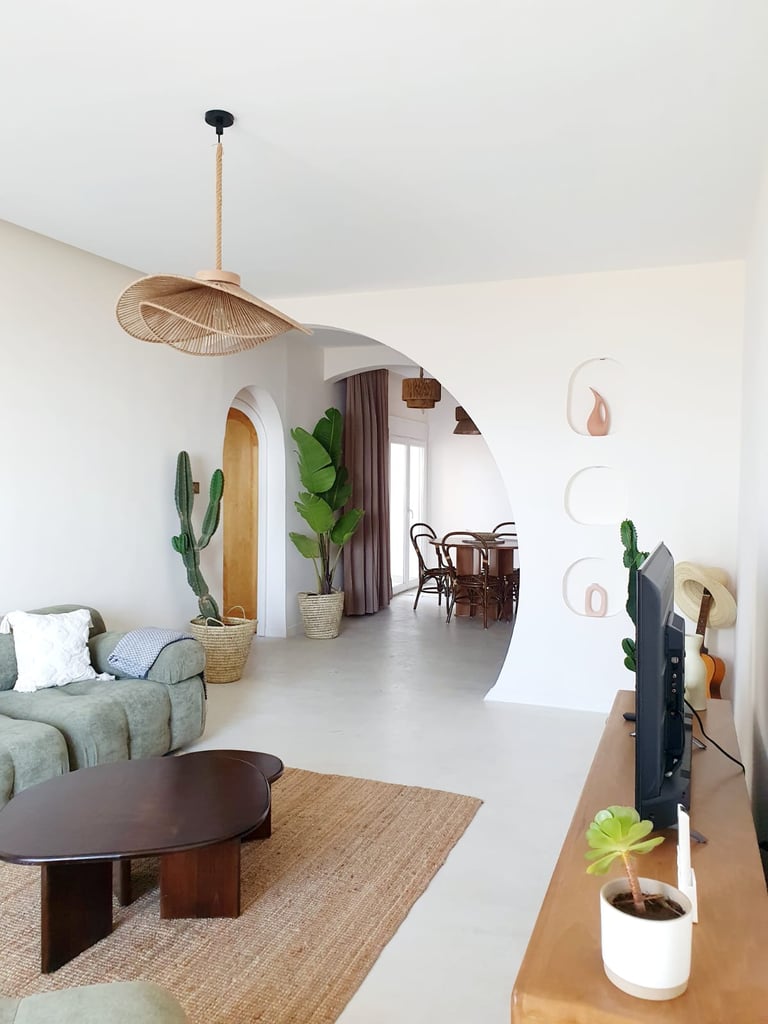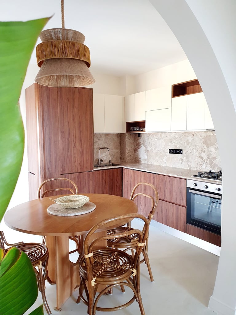 Les murs d'un blanc immaculé subliment les matériaux naturels : portes cintrées en bois blond, suspensions en rotin tressé et mobilier aux lignes organiques. La cuisine compacte marie élégance et fonctionnalité avec ses façades bicolores bois et blanc cassé, relevées par une crédence en marbre beige veiné et un éclairage LED intégré.