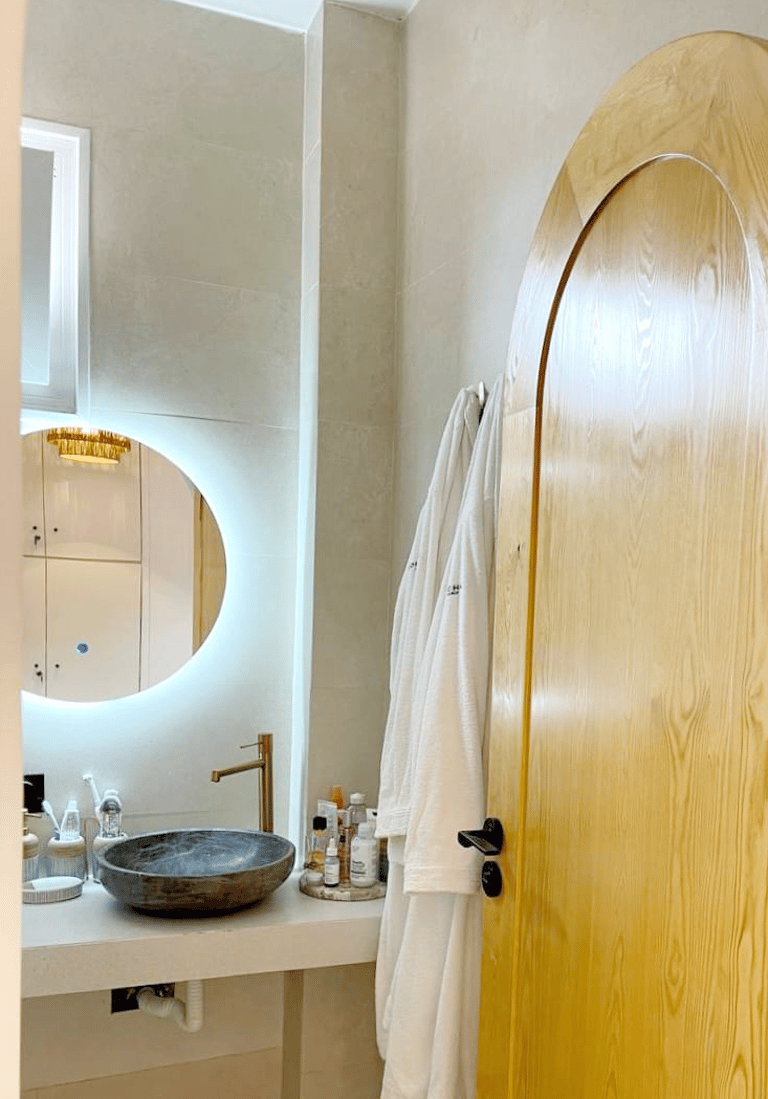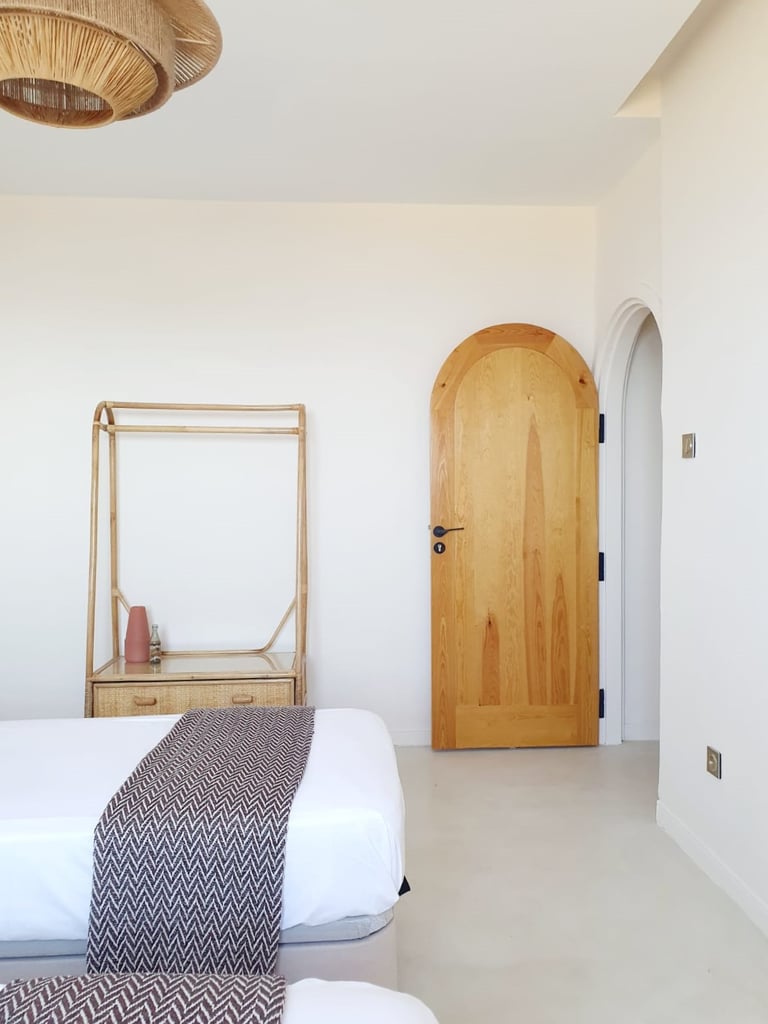 Les chambres cultivent la même sobriété chaleureuse, tandis que la salle de bain joue sur les contrastes avec son miroir circulaire rétroéclairé et sa vasque artisanale en pierre sombre. Chaque détail architectural - des niches murales sculptées aux revêtements de sol en béton ciré clair - compose un ensemble harmonieux où modernité minimale et douceur méditerranéenne dialoguent face à l'horizon marin.