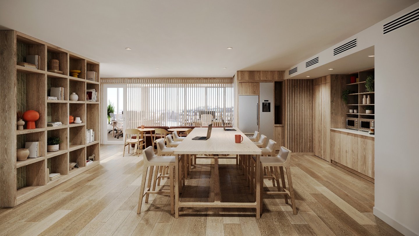 L'espace cuisine-cafétéria propose une grande table monastique en chêne massif avec bancs assortis, flanquée d'une bibliothèque murale XXL en bois brut. Les lamelles verticales dissimulent l'électroménager intégré. Des stores vénitiens en bois filtrent la lumière en créant des jeux d'ombre graphiques.
