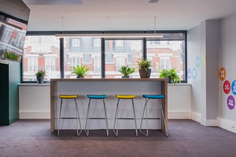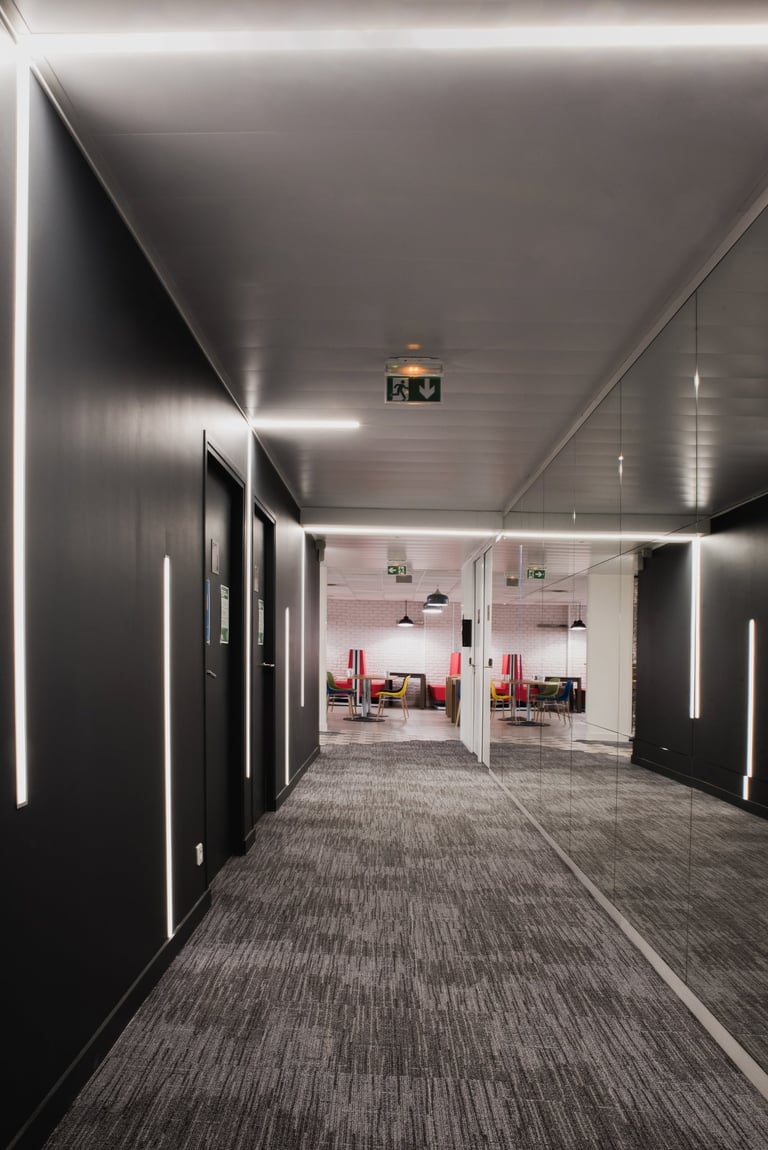 Le sol de la cantine a été artistiquement recarrelé avec un design moderne et ravivé avec des sièges aux couleurs vives et un jardin intérieur. La grande salle de réception / réunion à l’extrémité opposée du bâtiment a été entièrement modernisée avec un concept Scandinave.