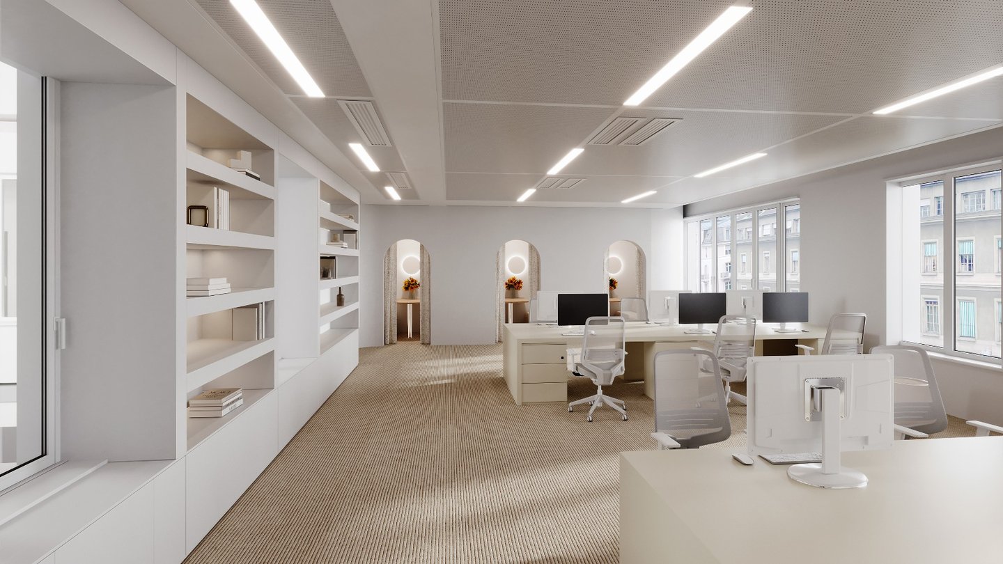 Trois niches architecturales cintrées percent le mur du fond, créant des alcôves éclairées en rétro qui abritent des tables en bois naturel pour des reunions en 1/1. Une bibliothèque murale laquée blanc court le long d'une paroi vitrée, offrant un système de rangement aérien.