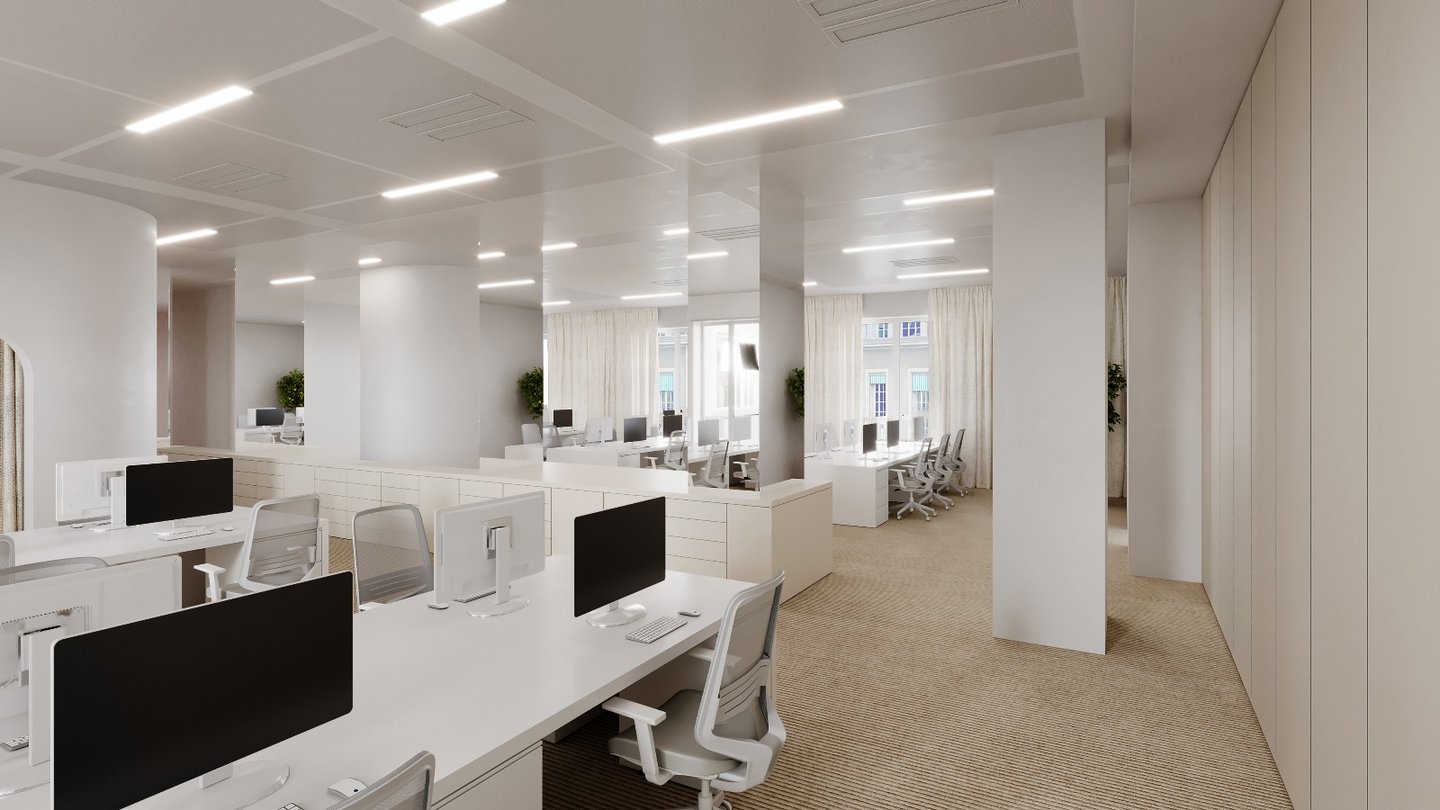 L'espace s'organise en îlots fluides avec des postes blancs équipés de doubles écrans et sièges ergonomiques. Les plans de travail laqués intègrent des caissons bas qui créent des séparations visuelles légères, préservant une intimité sans cloisonner. Le sol en moquette tissée beige apporte douceur acoustique et confort.