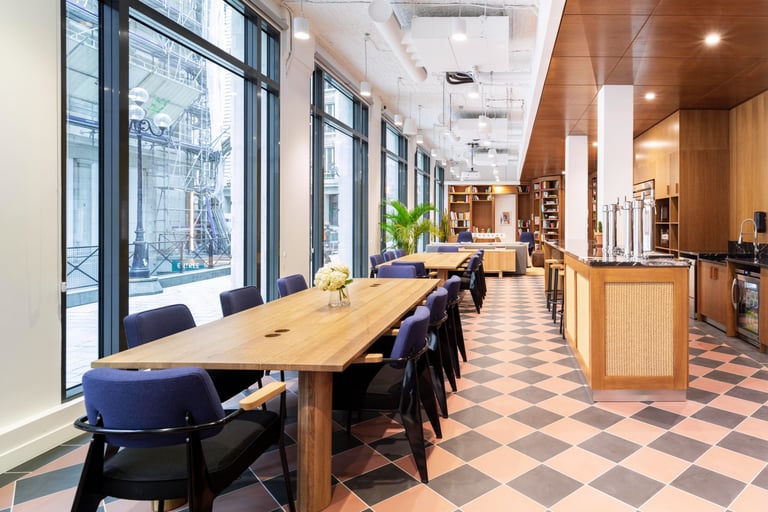 Le mobilier, mélangeant canapés modulaires profonds, poufs en velours et longues tables en bois clair, est choisi pour sa fonctionnalité et son confort, soutenant l'esprit communautaire de ces bureaux. L'utilisation de matériaux traditionnels comme la pierre, le marbre et les carrelages en terre cuite rend hommage à l'esthétique parisienne, tout en étant juxtaposée à des touches de décoration avant-gardiste. L'ensemble reflète une réinterprétation réussie des codes du bureau, transformant un actif historique en un lieu de vie dynamique, performant et hautement esthétique, parfaitement intégré à l'environnement d'affaires.