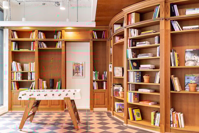 Le design jongle habilement entre l'ambiance industrielle chic, avec des plafonds techniques souvent laissés apparents, et une atmosphère de club feutré. On découvre ainsi des zones de détente aux allures de bibliothèque, caractérisées par des boiseries sombres et des sols en carrelage à motifs géométriques, favorisant le confort et l'échange informel. À l'opposé, une salle karaoké propose un contraste saisissant avec une ambiance nocturne, grâce à des murs et plafonds acoustiques noirs rehaussés par une boule à facettes et des LED linéaires, invitant à la décompression.