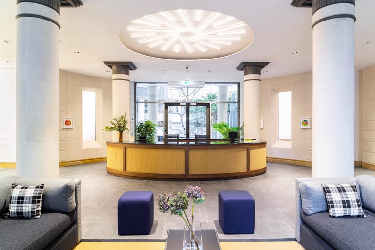 Ce projet situé dans le 9eme arrondissement, s'inscrit dans un cadre architectural Haussmannien historique, restructuré pour offrir une expérience de travail moderne et collaborative. L'accueil, majestueux et symétrique, rappelle l'héritage classique avec ses colonnes massives et ses matériaux nobles, notamment un comptoir élégant complété par un éclairage zénithal circulaire contemporain qui brise la rigueur. L'ensemble des espaces est baigné de lumière naturelle grâce à de vastes baies vitrées, typiques des rénovations haut de gamme, qui mettent en valeur des intérieurs chaleureux.